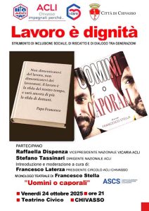 Le ACLI di Chivasso hanno organizzato l’incontro/dibattito “Lavoro è dignità, strumento di inclusione, di riscatto e di dialogo tra generazioni”, che si è tenuto venerdì 24 ottobre 2025, alle ore 20:30, presso il Teatrino Civico, in piazza C.A. Dalla Chiesa a Chivasso.